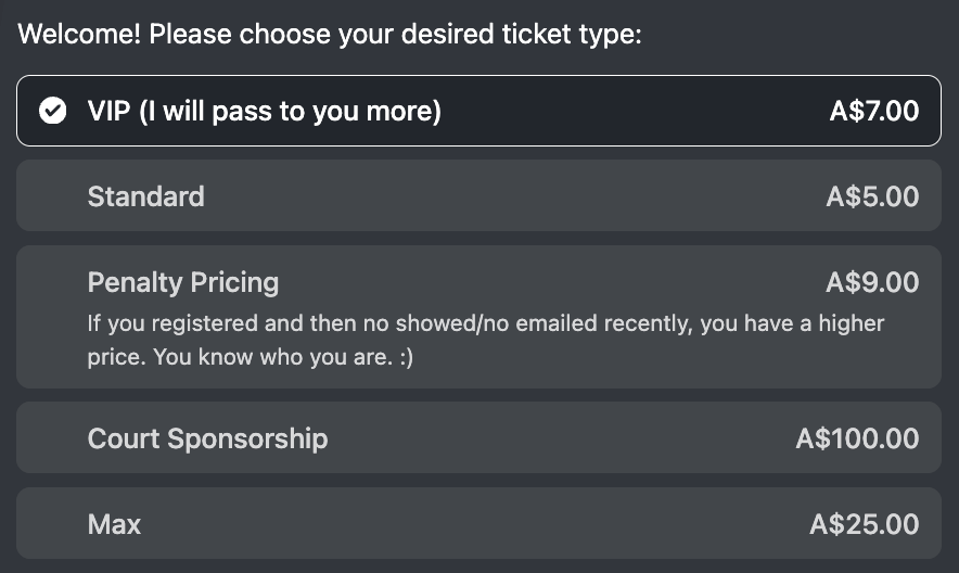We tested a new “VIP Ticket” model at 20-30% higher cost than our standard ticket pricing and 10/34 tickets sold in Sydney for 2 runs were at this higher cost.